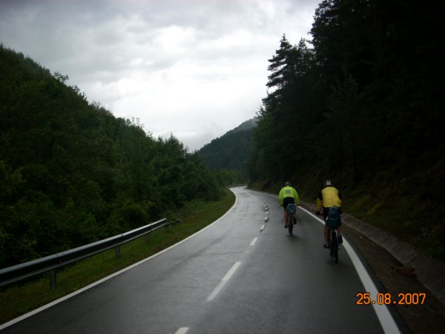 Hemos dado cuenta del bocadillo dentro de Irati, en una zona de recreo e información del paraje. Hemos pasado cerca de las ruinas de la histórica fábrica de armas de Orbaiceta. Los pinchazos se han cebado hoy, raletizándonos un poco. Hemos llegado a Roncesvalles con ilusión, lugar de partida del camino de Santiago, una de las cosas que queremos hacer también, aquí nos hemos hospedado en El hostal La Posada. Sitio animado por la presencia de peregrinos hacia Santiago. Teníamos bastante hambre a la hora de la cena y lo único que hemos conseguido es hacer sonreir a la camarera que se llevaba y traía los platos de la mesa, creo que imaginaba que no necesitaban pasar por el lavavajillas.